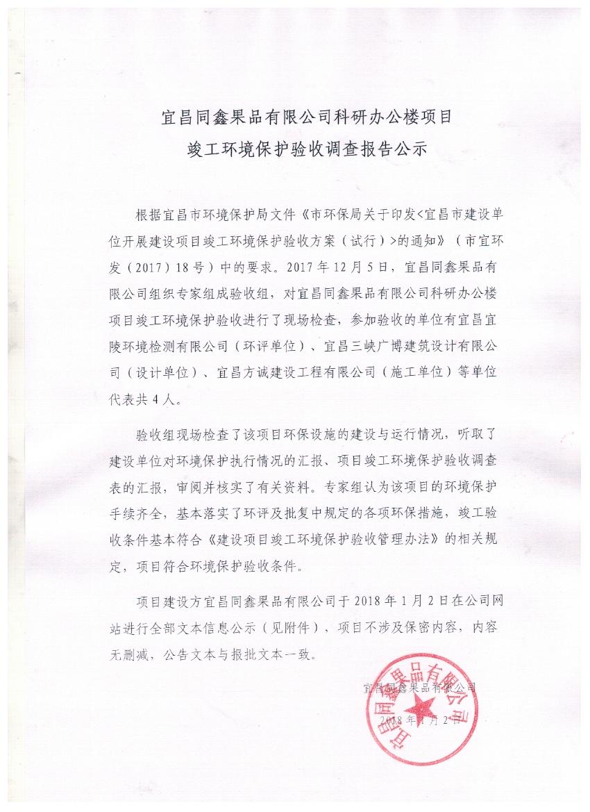 宜昌同鑫果品有限公司科研辦公樓項目竣工環保驗收報告公示